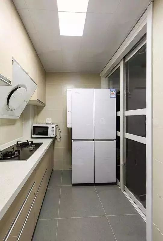 厨房还是很大的,7字型厨房,空间可以容纳好几个人在厨房里面