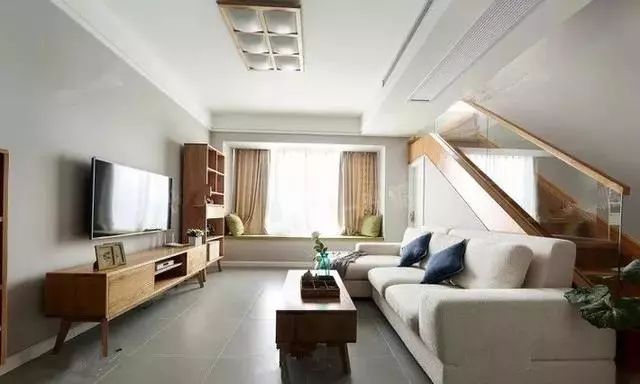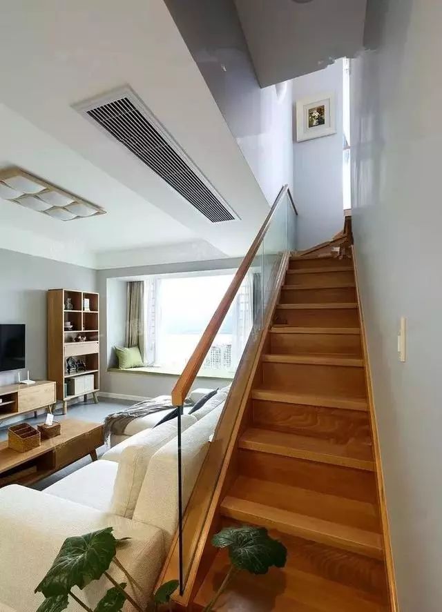 沙发前后就是上二楼的楼梯,还做了玻璃护栏。