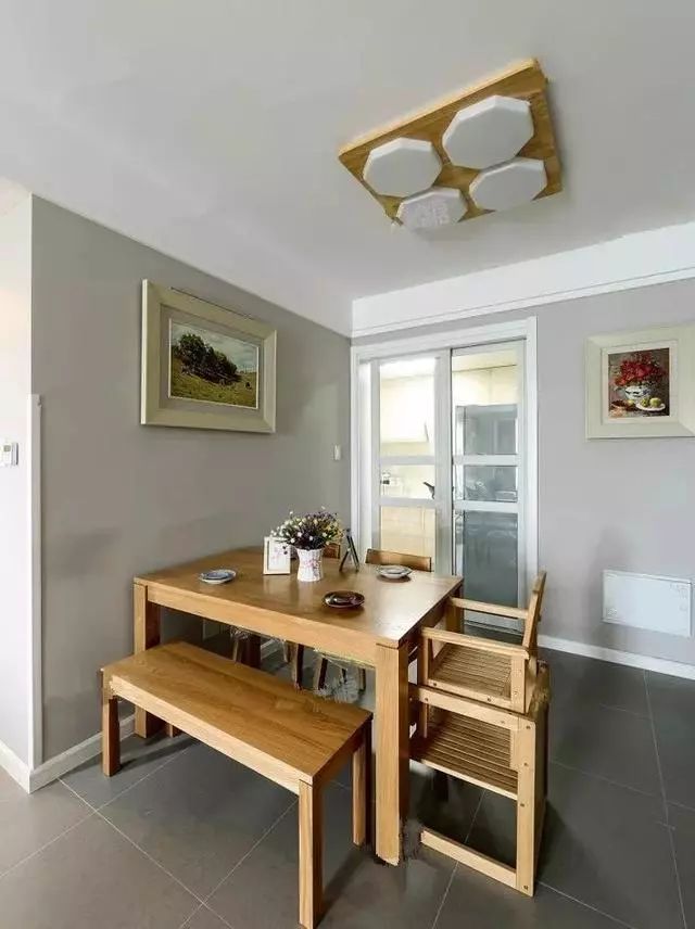 面积不是很大,所以餐桌靠着墙面放可以省出不少空间过道。