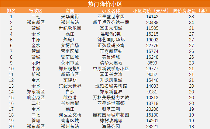 热门降价小区中,亚星盛世家园降价房源量位居榜首,小区位于二七区嵩山路与长江路交叉口向西300米路北,临近二七万达、郑州市第二人民医院及多所学校,配套成熟,均价14142元/平方米。郑东新区的新里卢浮公馆一期和管城区的富田太阳城降价房源也较多,分别有34套、31套二手房降价,小区均价为20488元/平方米和11505元/平方米。